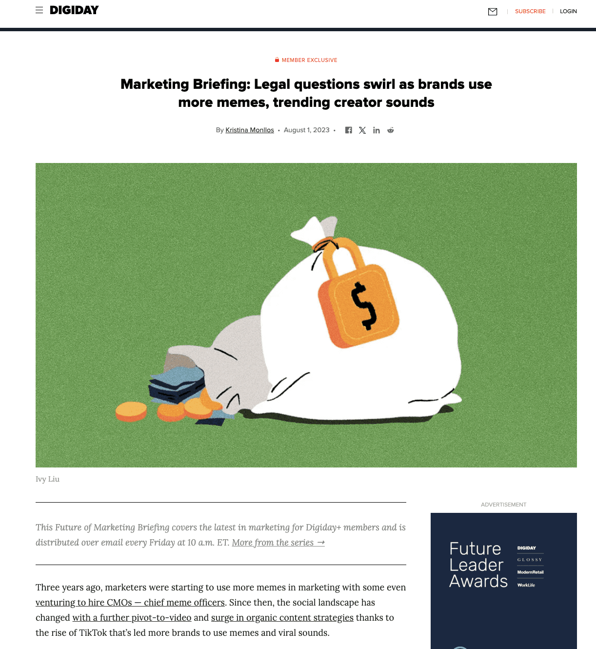 For Digiday, I was interviewed on my take on marketing teams considering legal implications when repurposing memes for their own advertising. Read more here.