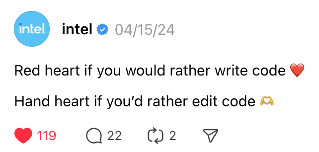 Additionally, I also oversaw trending content format on Intel's owned TikTok channel, as well as launched and managed Intel Corporation's owned Threads channel in which we utilized copy-only formats to gain traction and over 300k followers within 6 months.
